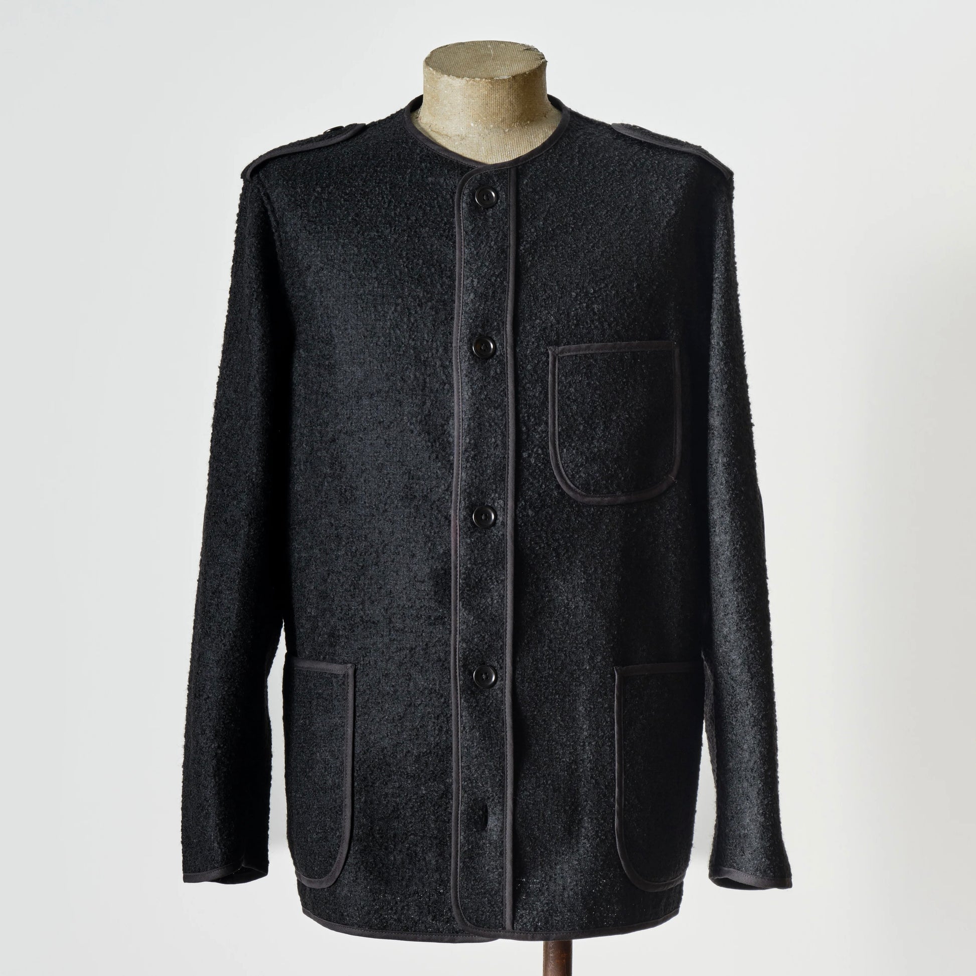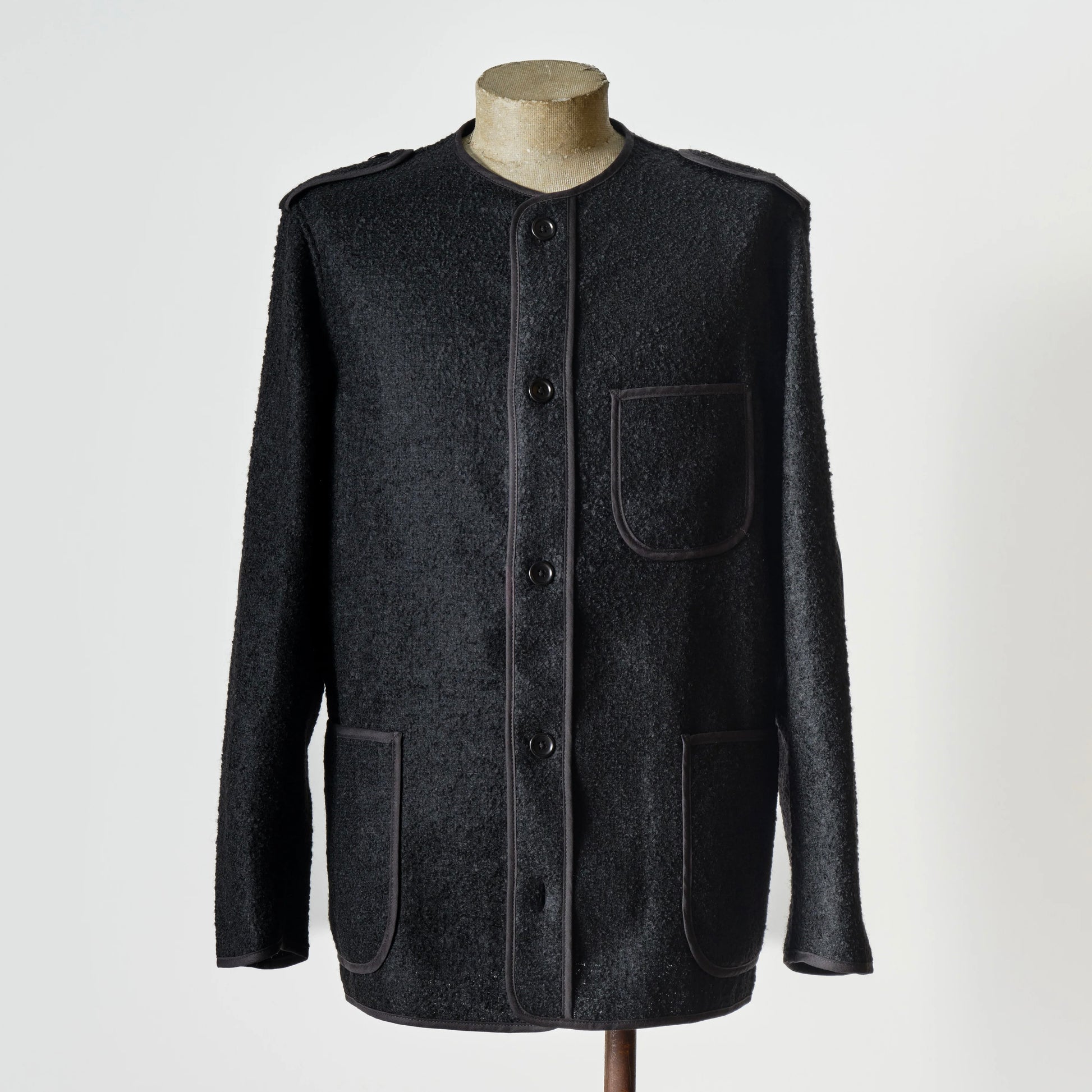 ・A jacket with a distinctive collarless, epaulet, and elbow patch.