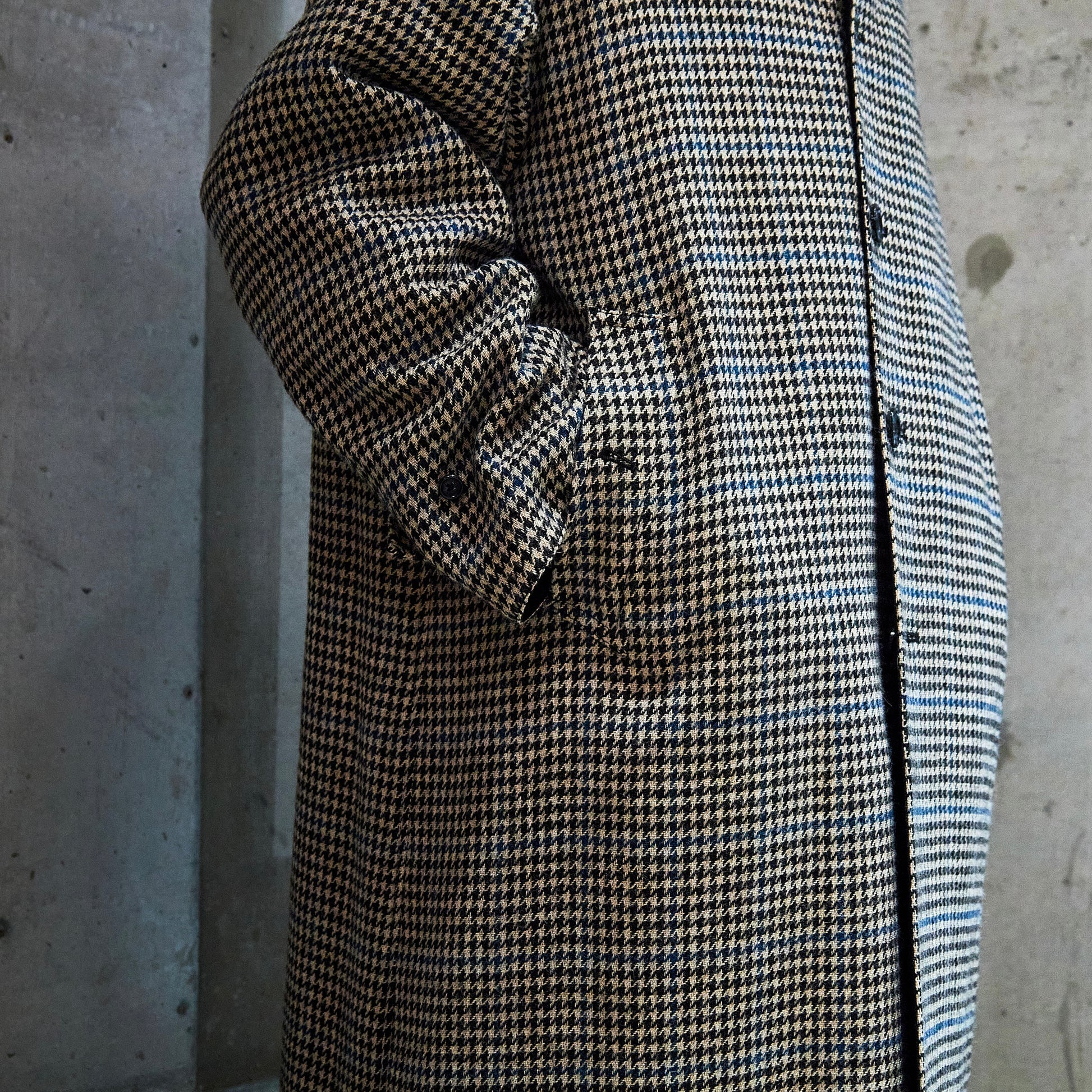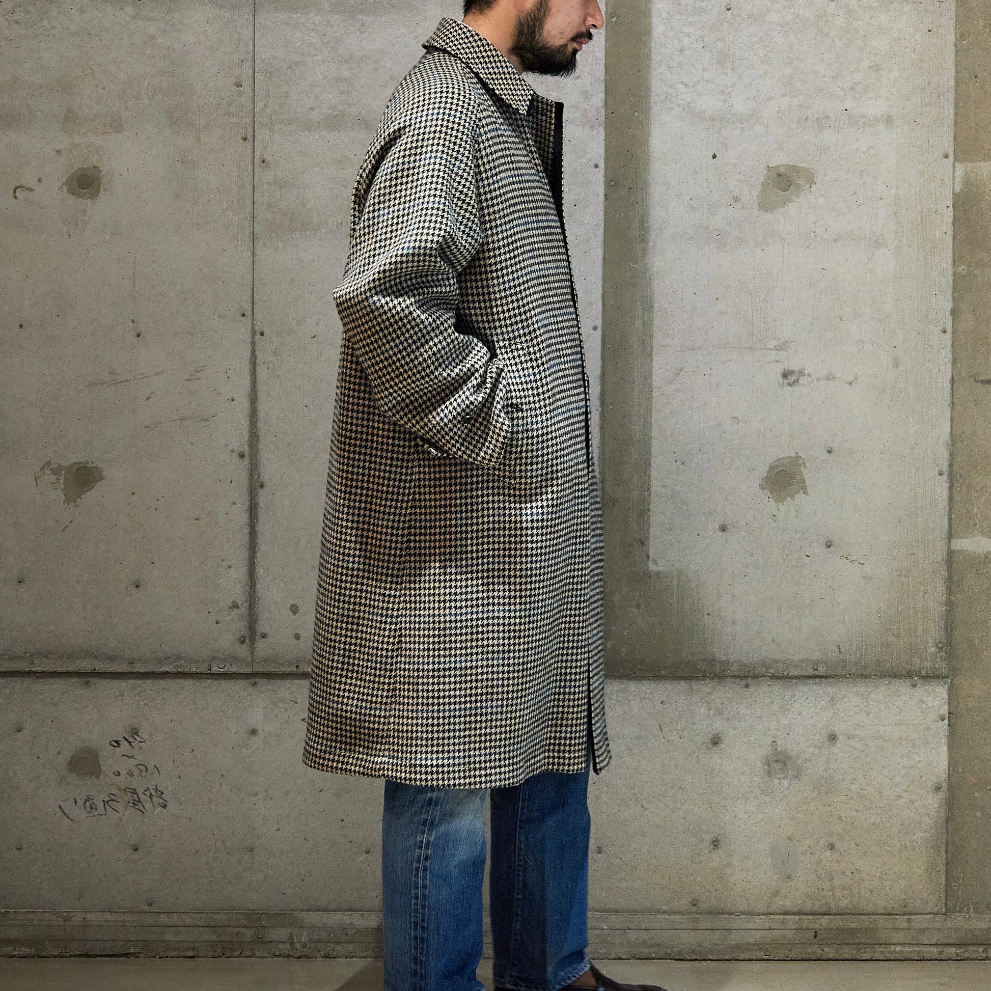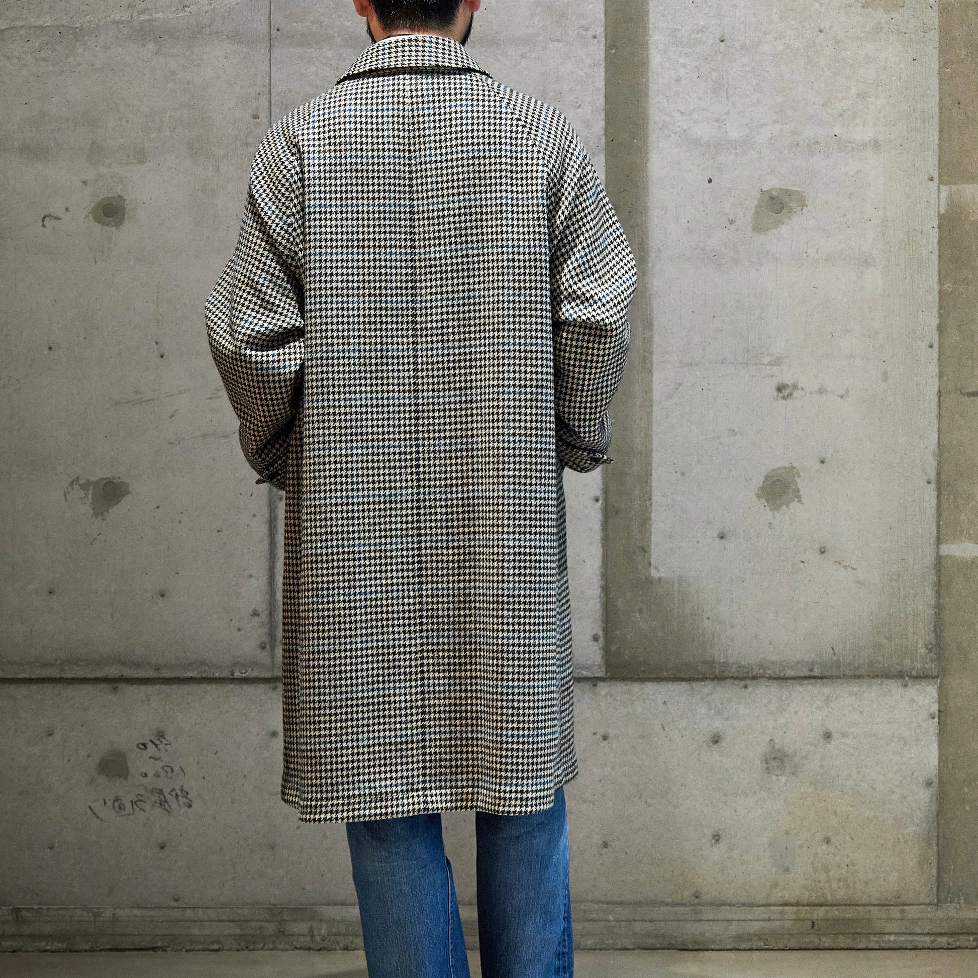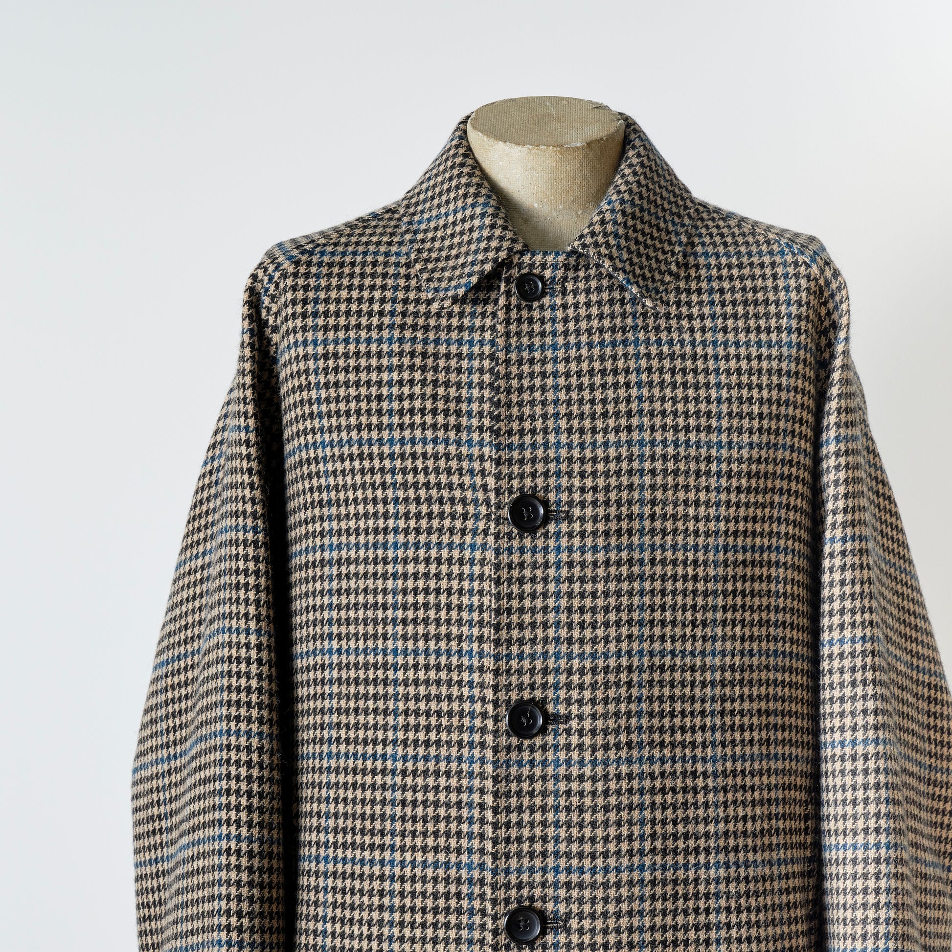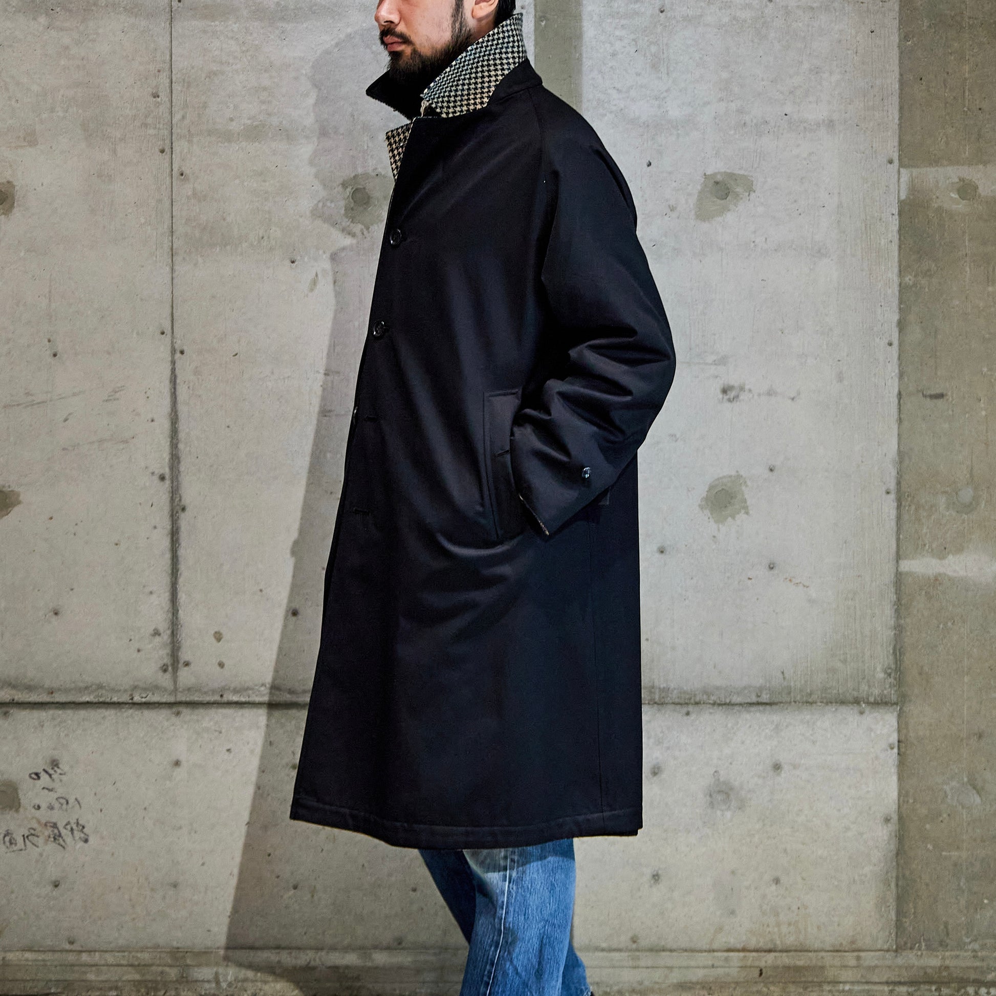 ・高い撥水性があるオリジナル高密度コットンギャバジン生地と、ブラック×ナチュラルの千鳥格子にブルーのオーバーチェックが入るツイード生地のリバーシブル。