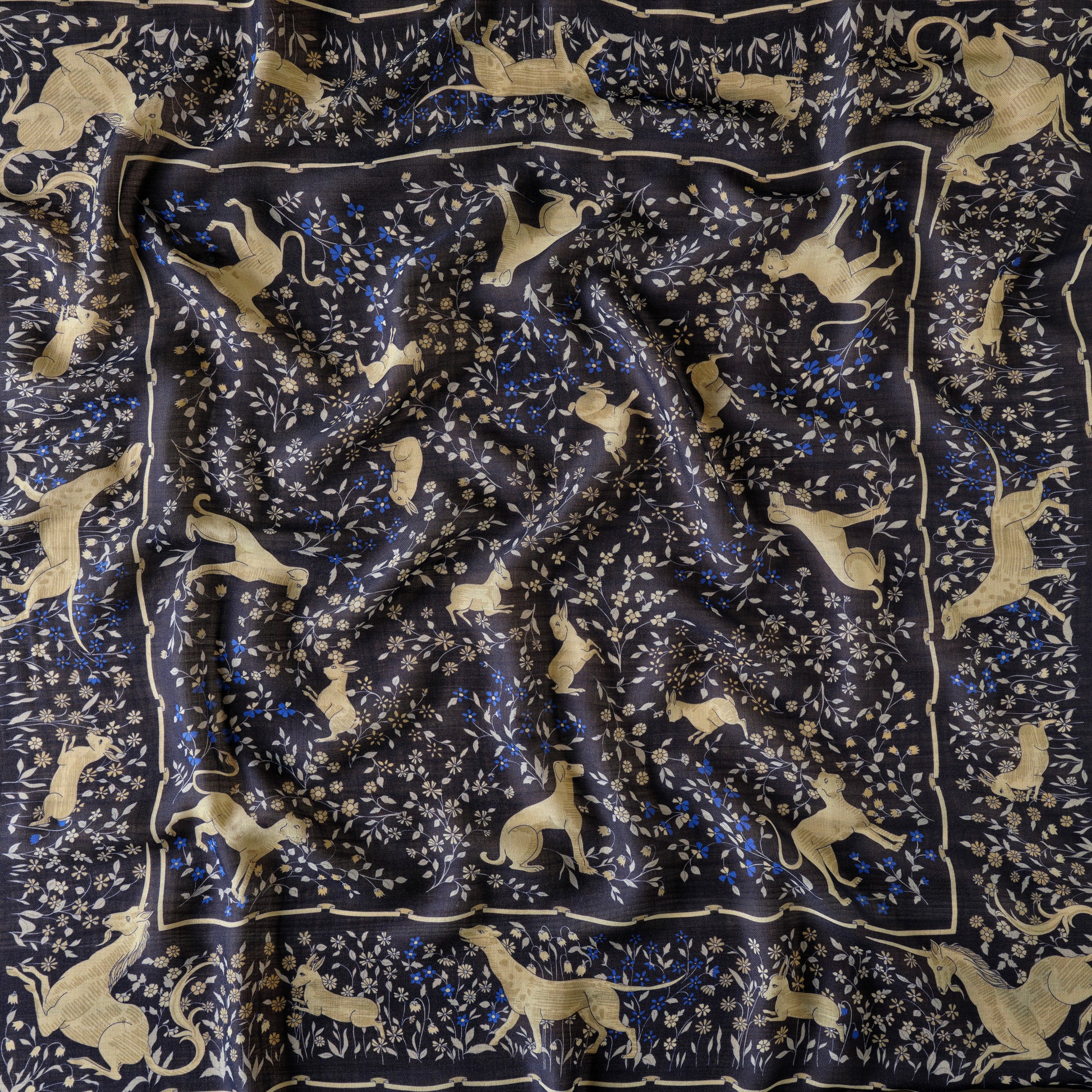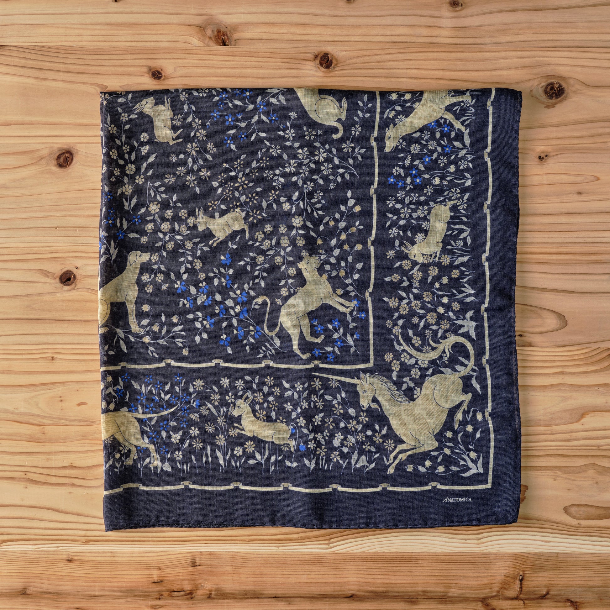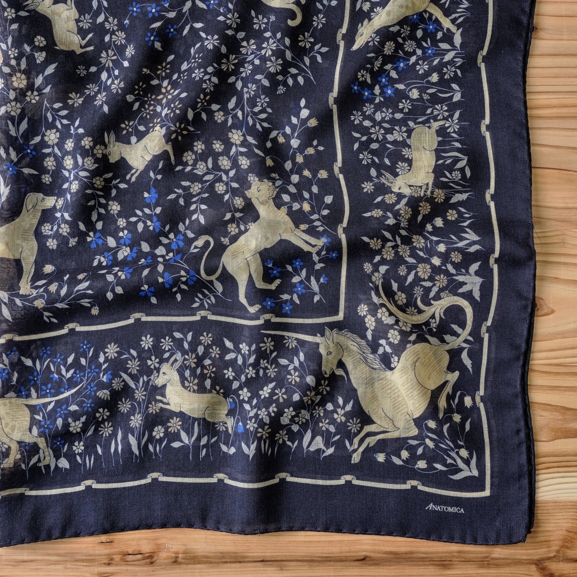・ユニコーンをはじめとする様々な動物たちと、草花が描かれたスカーフ。