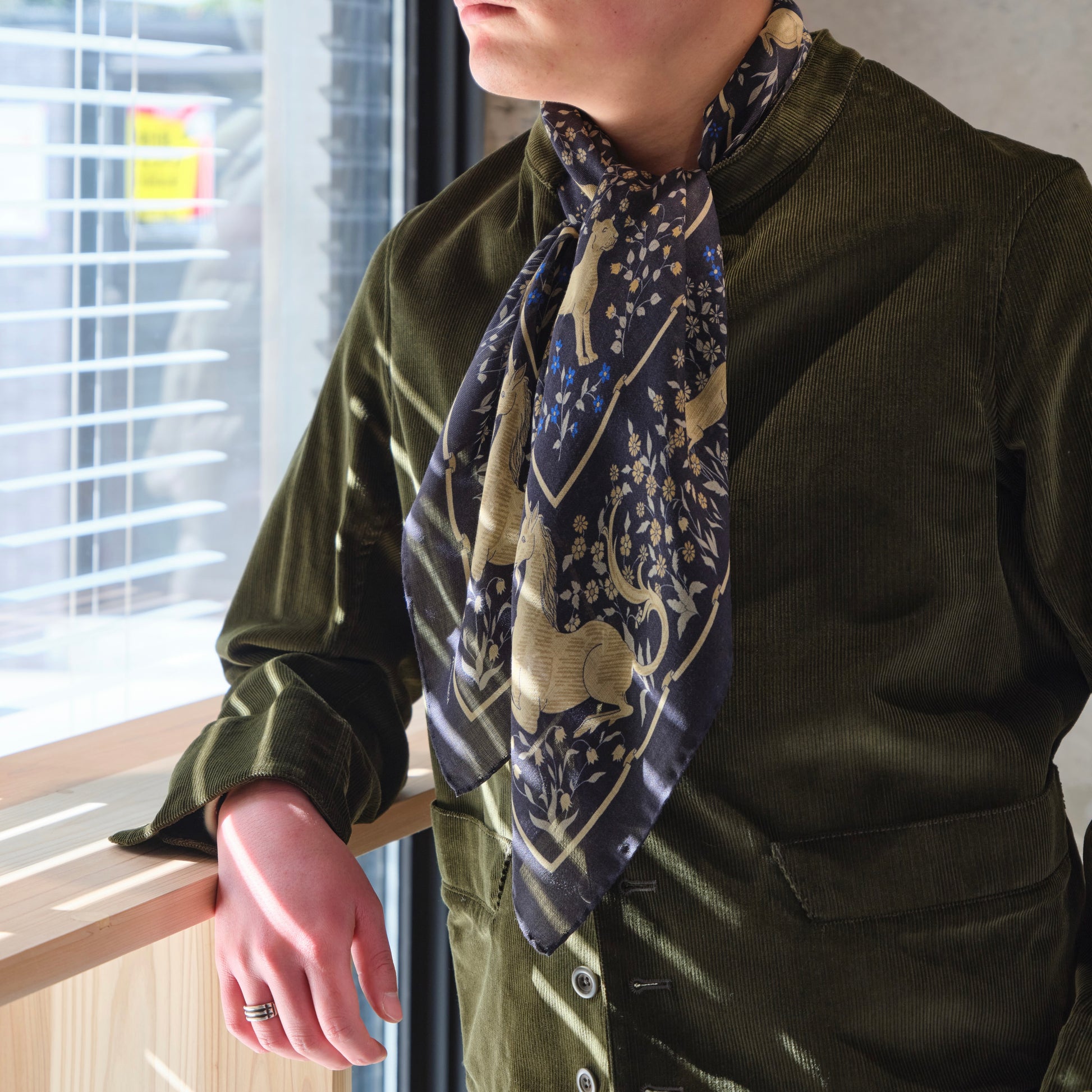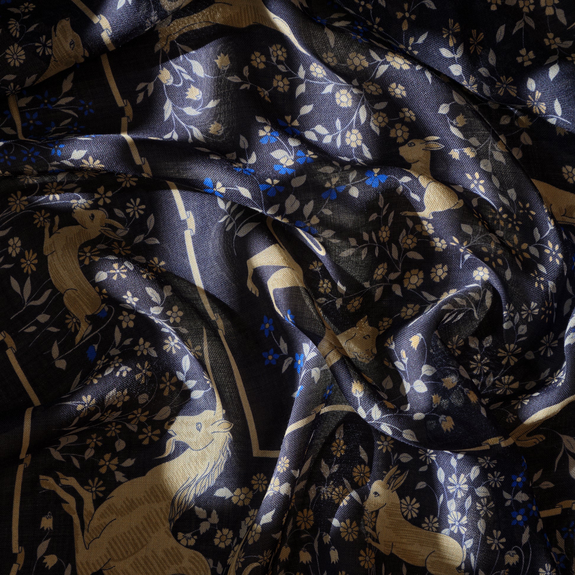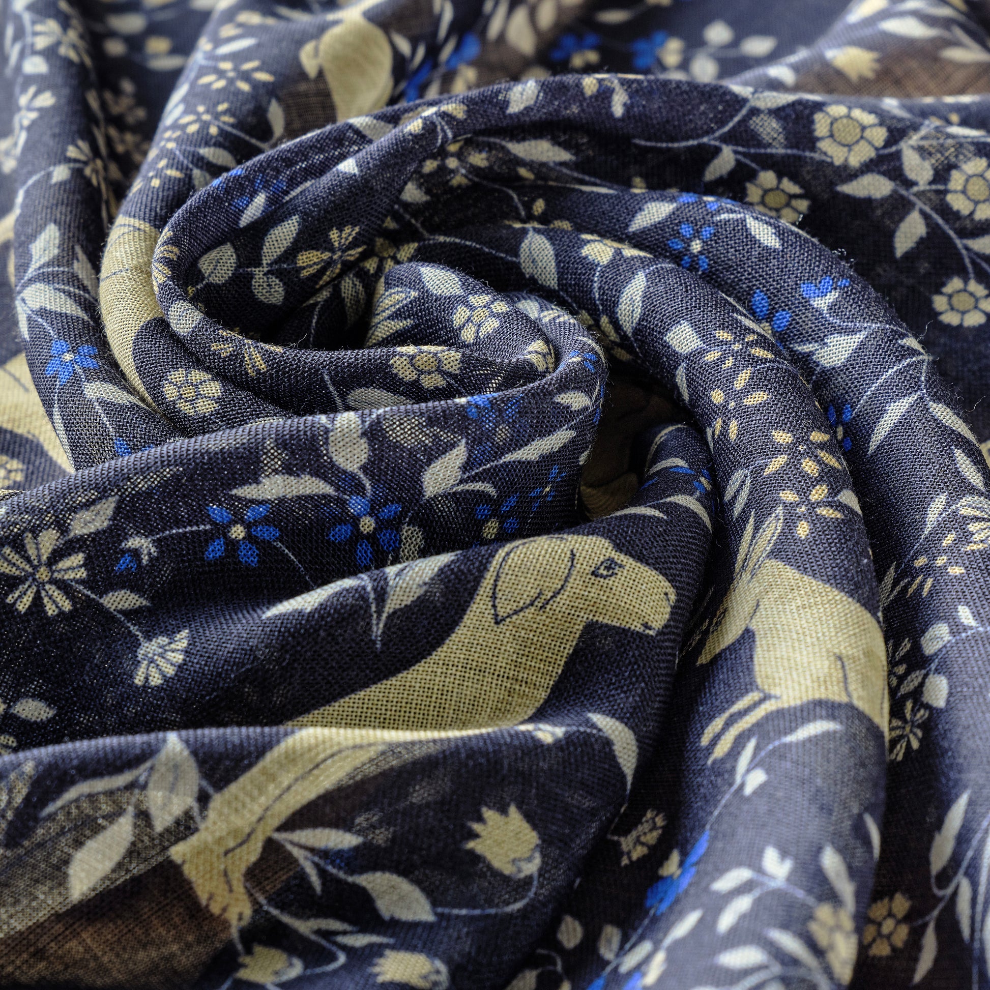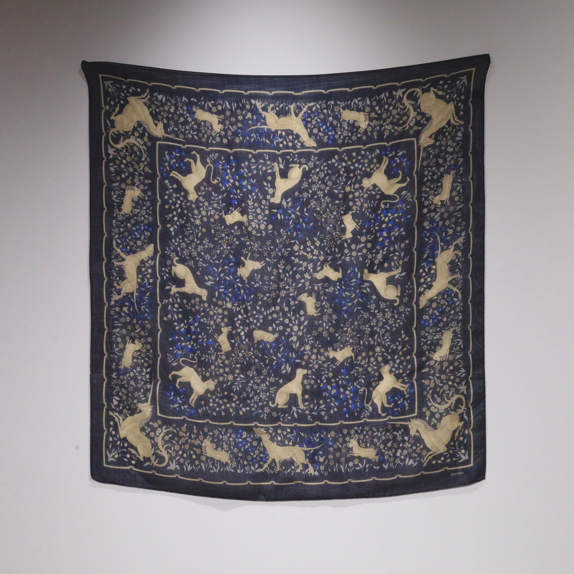 ・ユニコーンをはじめとする様々な動物たちと、草花が描かれたスカーフ。